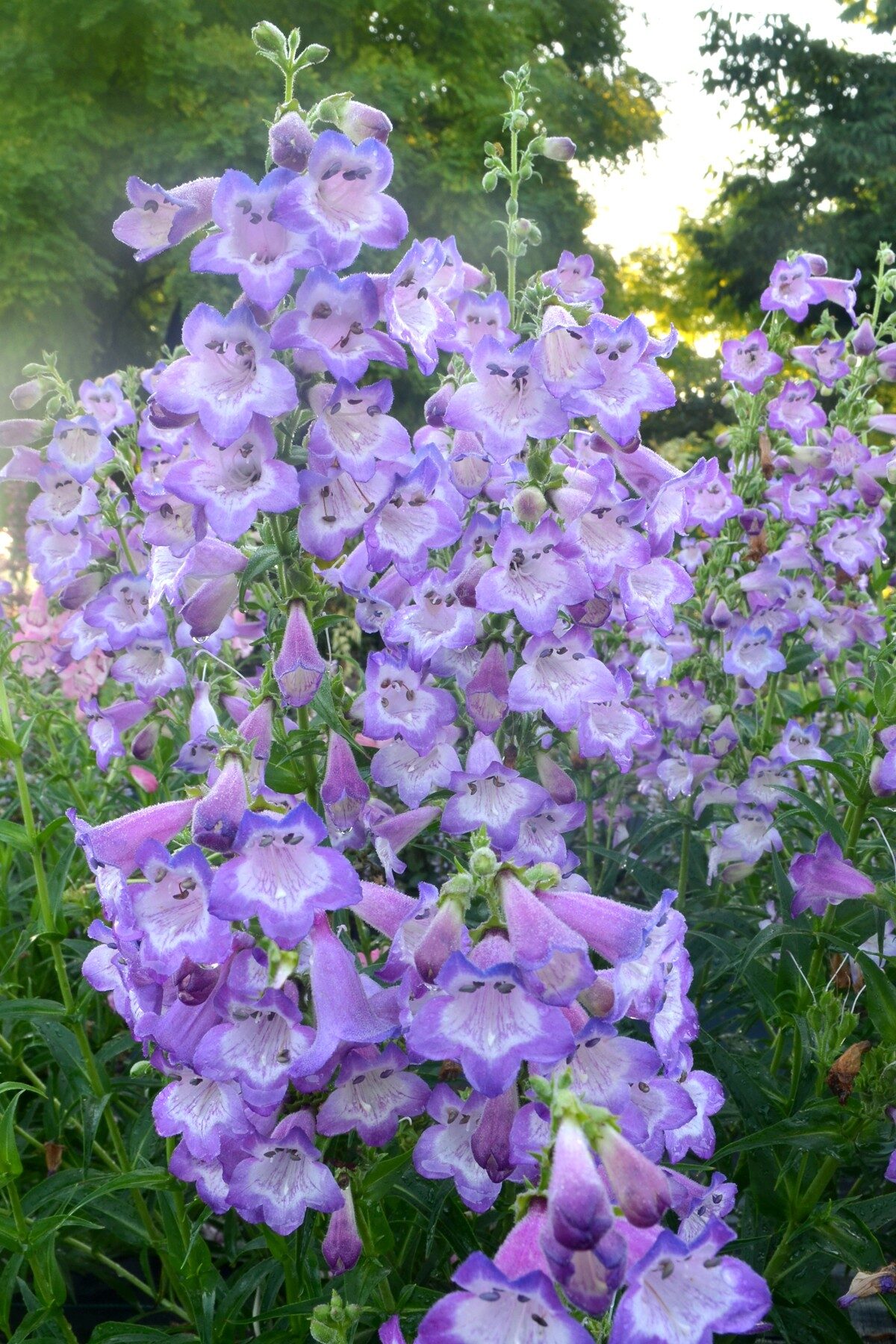 A bushy perennial with elongated green leaves. Lavender blooms, highlighted with white throats.